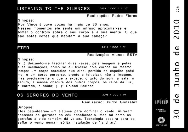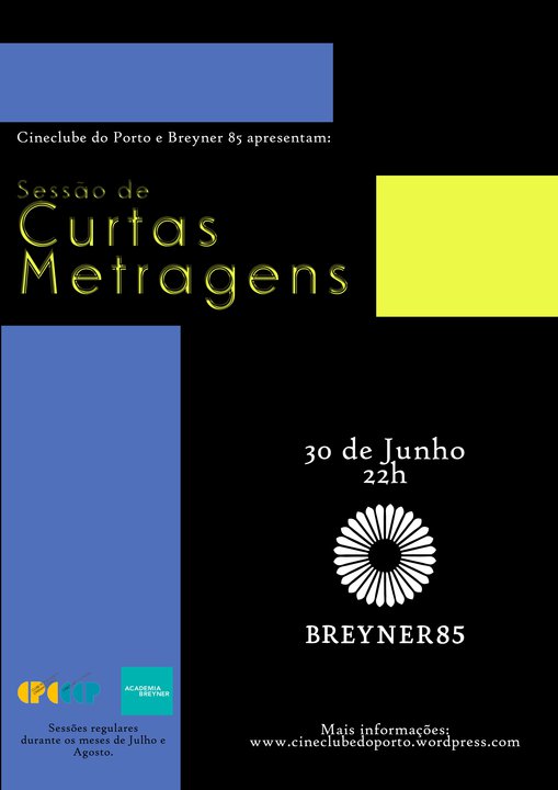 Nesta próxima quarta-feira, dia 30, vai-se realizar no Breyner 85 – rua do Breyner nº85- uma sessão de curtas-metragens documentais às 22 horas.