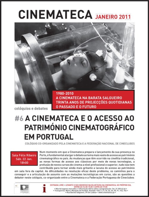 Neste Sábado, dia 22 de Janeiro, às 18h, o Cineclube do Porto desloca-se a Lisboa para participar num coloquio co-organizado pela Cinemateca e pela Federeção Portuguesa de Cineclubes sobre o acesso ao património cinematográfico no país.