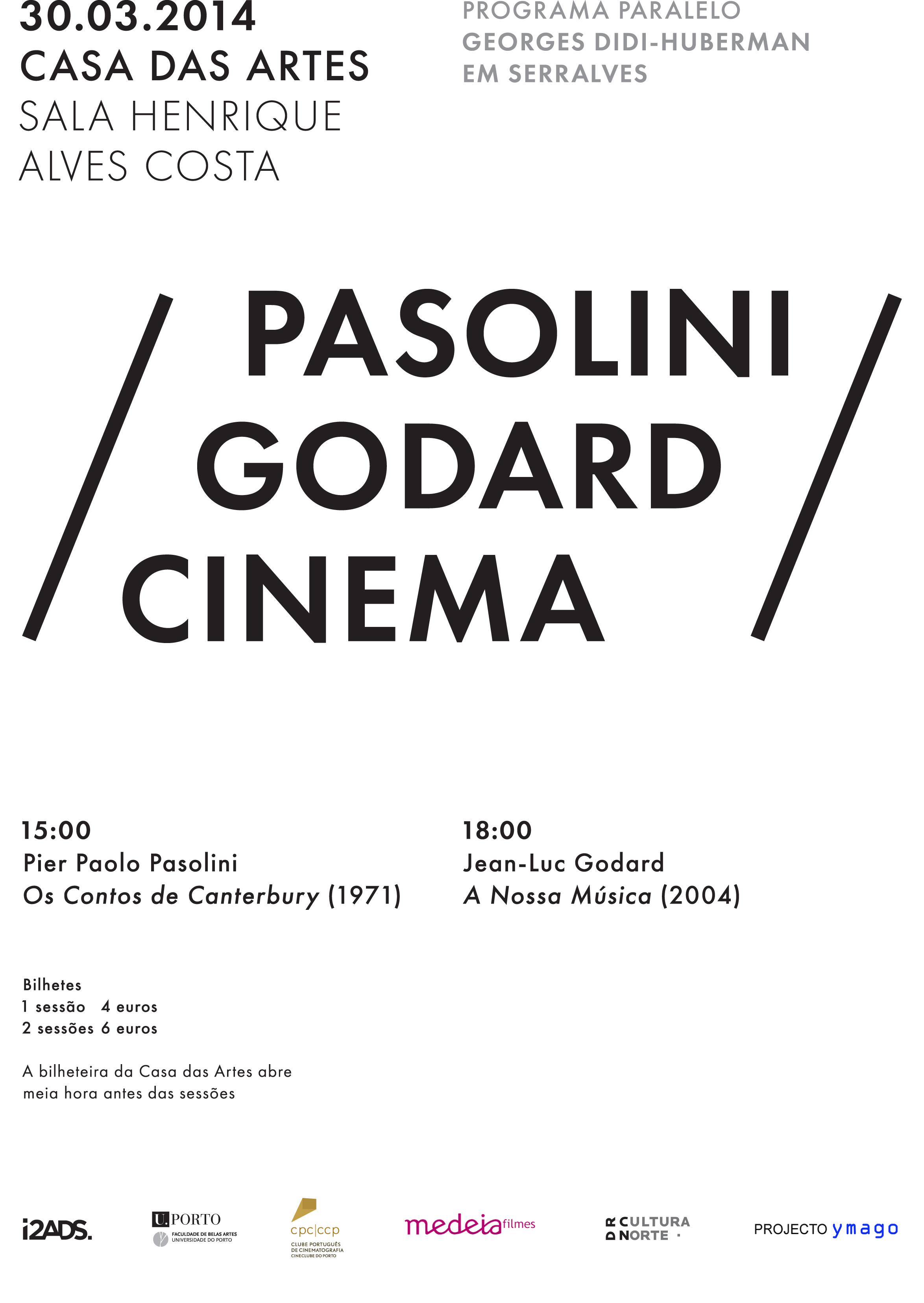 No âmbito da vinda de Georges Didi-Huberman ao Porto, organizada pelo i2ADS (Instituto de Investigação em Arte, Design e Sociedade, da Universidade do Porto), que proferirá, no dia 29 de Março, às 16h, no Museu de Serralves, uma conferência com o título “Cinema e Poesia: Godard face a Pasolini”, a Medeia Filmes e o Cineclube do Porto associam-se ao i2ADS com a exibição, no dia seguinte (domingo, 30 de Março), na Casa das Artes (Sala Henrique Alves Costa), dos filmes OS CONTOS DE CANTERBURY, de Pier Paolo Pasolini e A NOSSA MÚSICA, de Jean-Luc Godard.