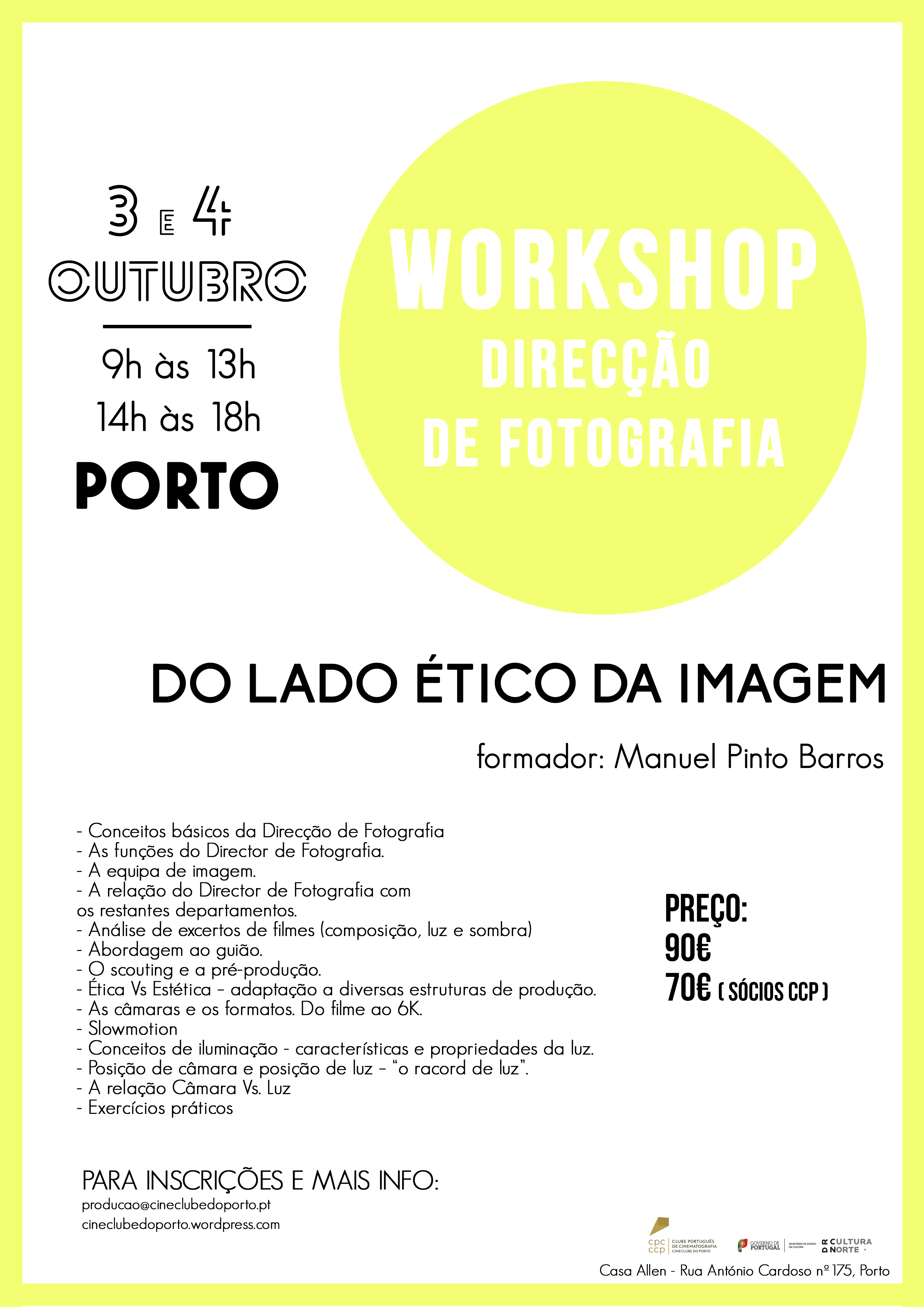 No fim de semana de 3 e 4 de Outubro o Cineclube do Porto promove na Casa Allen um workshop de Direcção de Fotografia orientado por Manuel Pinto Barros.