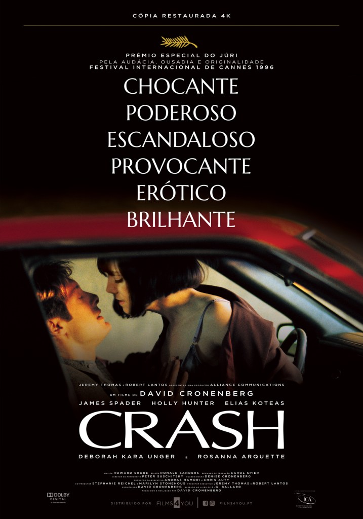 Um dos maiores êxitos da carreira de David Cronenberg e, também, um dos seus filmes mais controversos e polémicos. Adaptado do romance de J.G. Ballard, “Crash” é um filme demencial sobre o fascínio do sexo e da morte sobre rodas. Trata-se de uma macabra visão sobre a combinação entre erotismo e mutilação, autodestruição calculada e desejo sexual, morte violenta e acidentes rodoviários. James Ballard (James Spader), um produtor de filmes publicitários, tem um grave acidente de viação ao colidir com outro automóvel, que resulta na morte do outro condutor e deixa a mulher dele ferida. No hospital, Ballard perde-se e volta a encontrar Helen Remington (Holly Hunter), a viúva da vítima mortal do acidente.