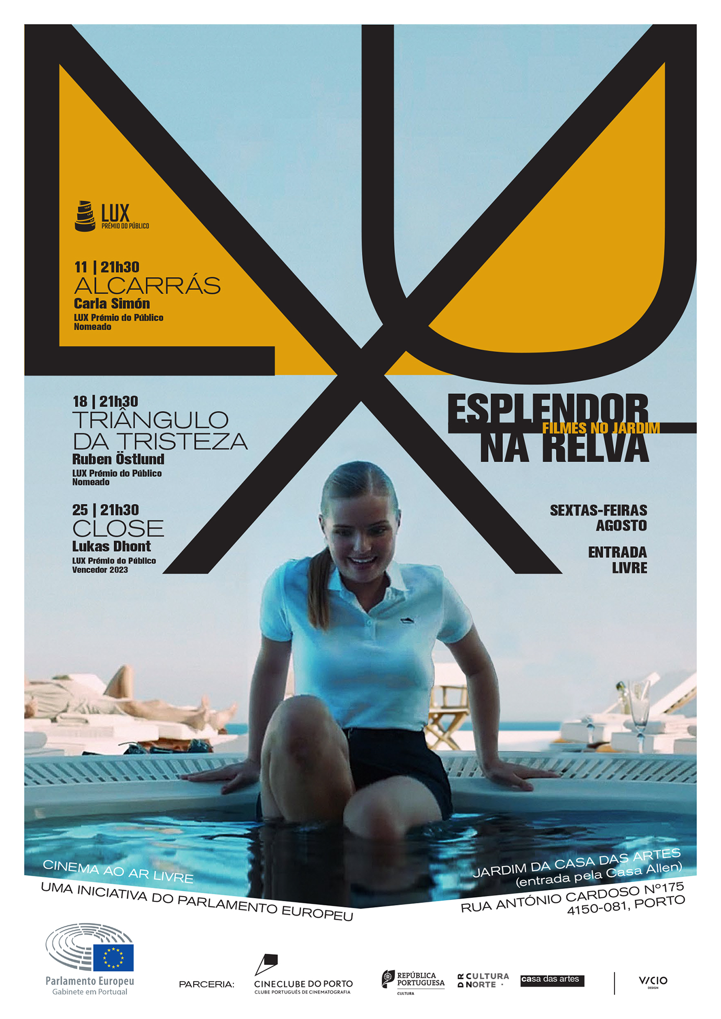 Em agosto (sextas-feiras 11, 18 e 25 às 21h30), voltamos à nossa parceria com o Parlamento Europeu, onde exibiremos 3 filmes nomeados ao Lux Film Prize deste ano, incluindo o vencedor de 2023, nos jardins da Casa das Artes (o mesmo jardim de sempre mas num novo local onde vos convidamos a trazerem uma manta para se sentarem no jardim junto ao lago da Casa Allen!).