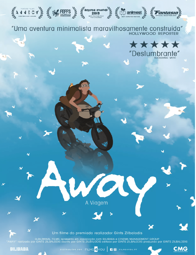 AWAY é um trabalho de amor, uma incrível longa-metragem de animação escrita e realizada por Gints Zilbalodis, contada em quatro capítulos, que acompanha um menino que viaja por uma terra misteriosa, cruzando desertos estéreis e belas florestas e perseguido por um espírito escuro implacável. Ao longo do caminho vai criando vários vínculos com diferentes animais e reflete o que o levou àquela ilha. Parte sonho, parte realidade, o enredo é, de certa forma, um reflexo do processo criativo da própria produção do filme. AWAY reflete sobretudo sobre a necessidade comum e universal de encontrar uma conexão.